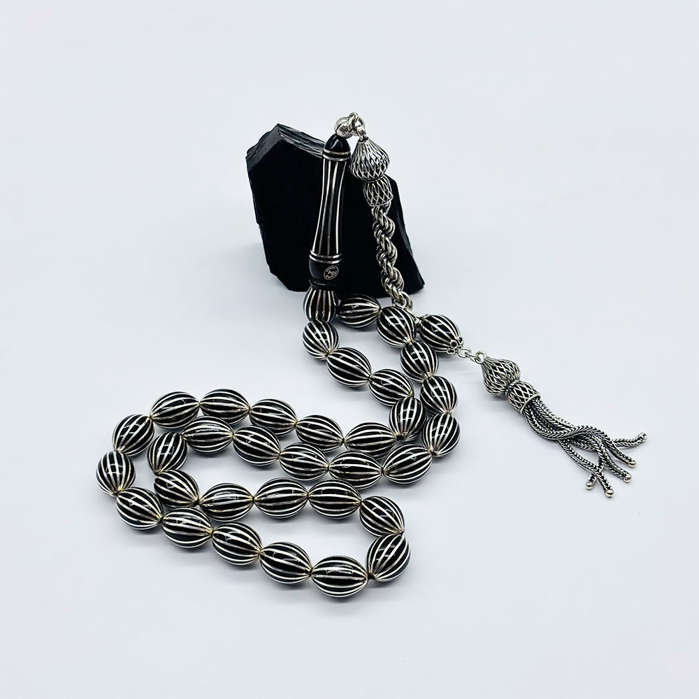 16 Lı Gümüş Karpuz Dilimi İşlemeli Erzurum Oltu Taşı Tesbih