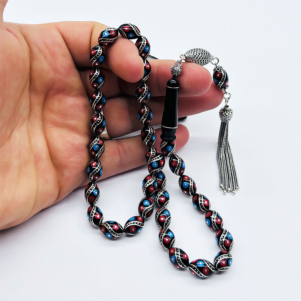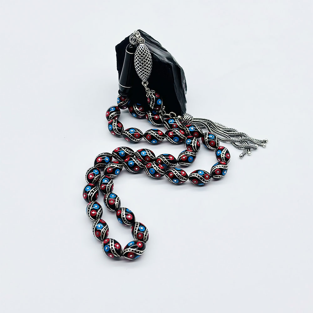 925 Ayar Gümüş İşleme renkli Orijinal Oltu Taşı Tesbih
