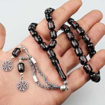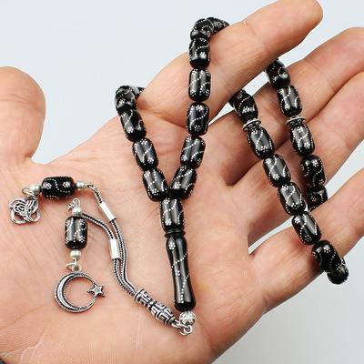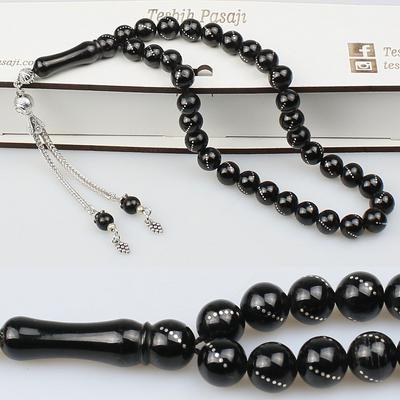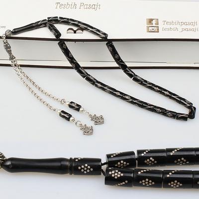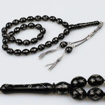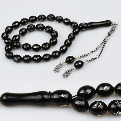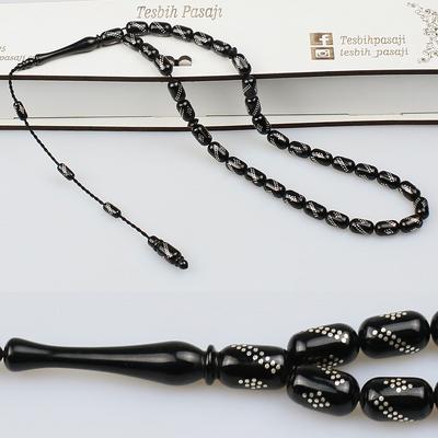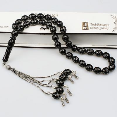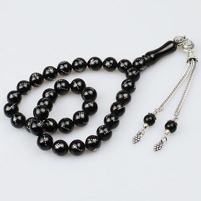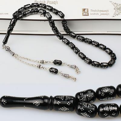 Gümüş Nakkaş İmameli Orijinal Erzurum Oltu Taşı Tesbih (9 x 9 mm) TP001606