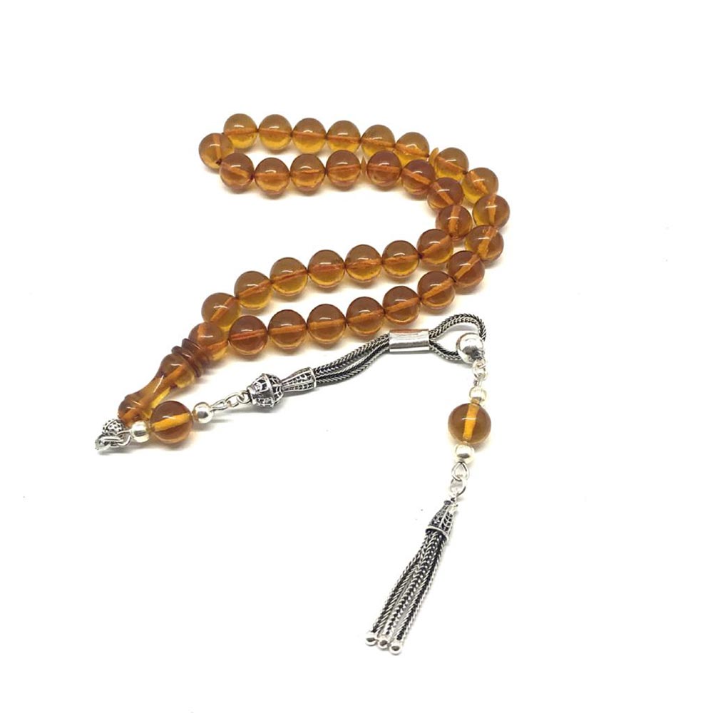 Bal Rengi Tonlarında Sarı Gümüş Püskül Ateş Kehribarı Tesbih