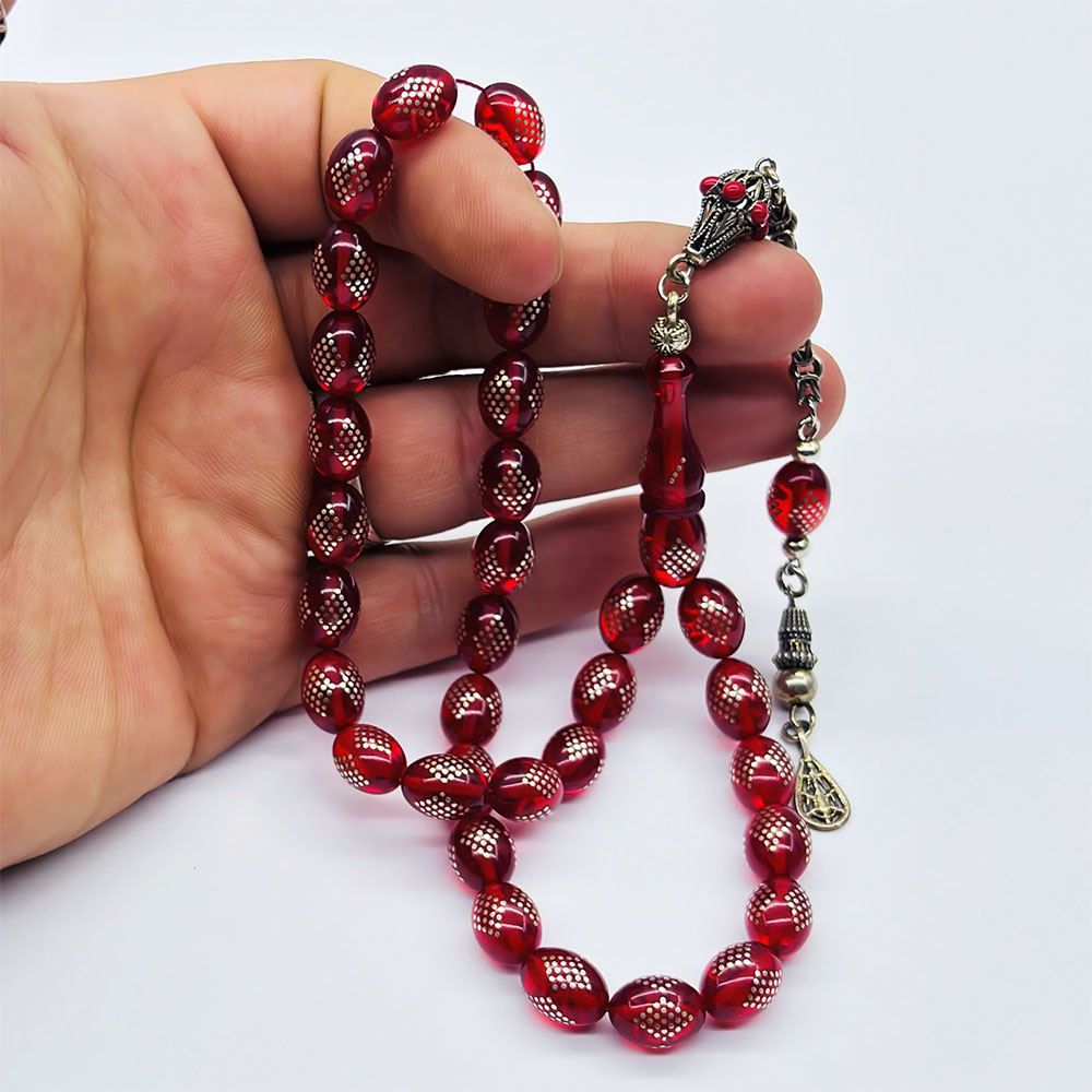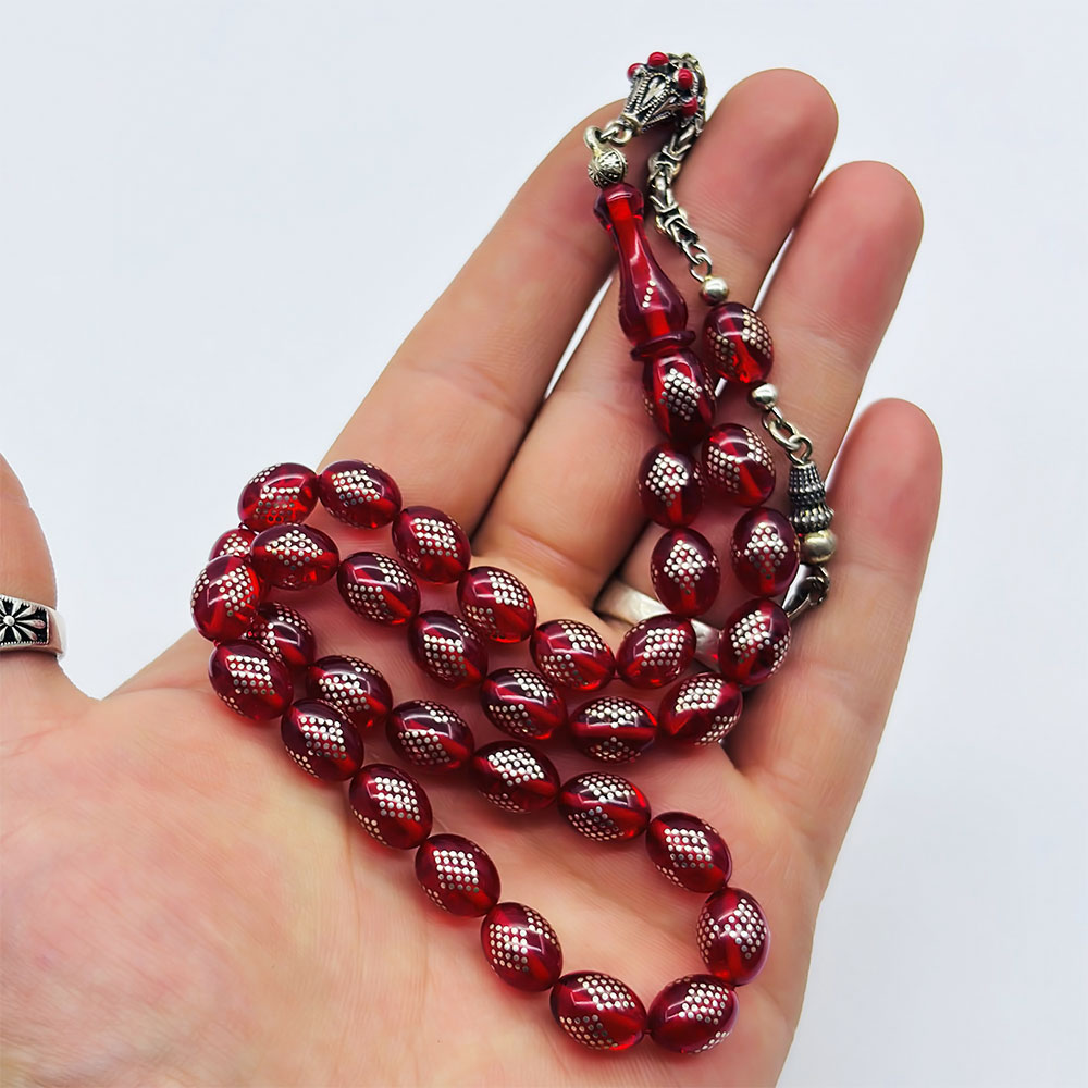 Bayrak Kırmızısı 925 Ayar Gümüş İşlemeli Sıkma Ateş Kehribar Tesbih