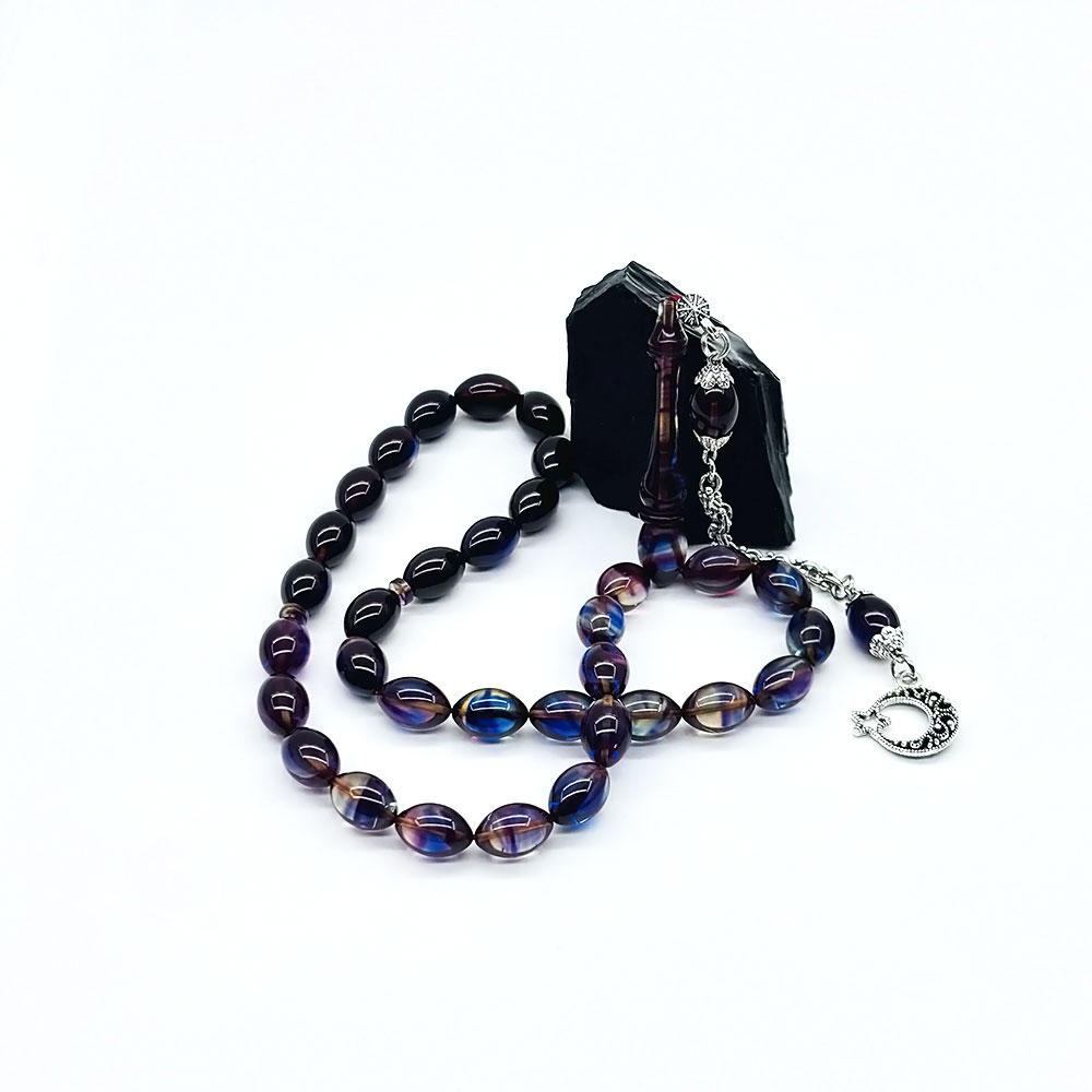 Mavi Renkte Hareli Sıkma Ateş Kehribar Tesbih