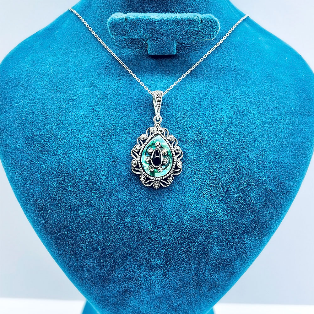 Özel karton kutusu ve özellikleri belirtilen kolye |