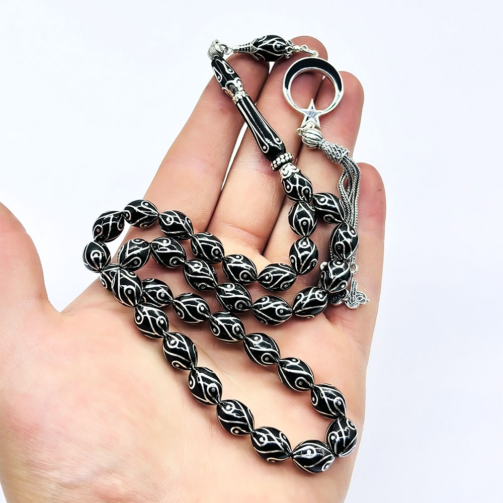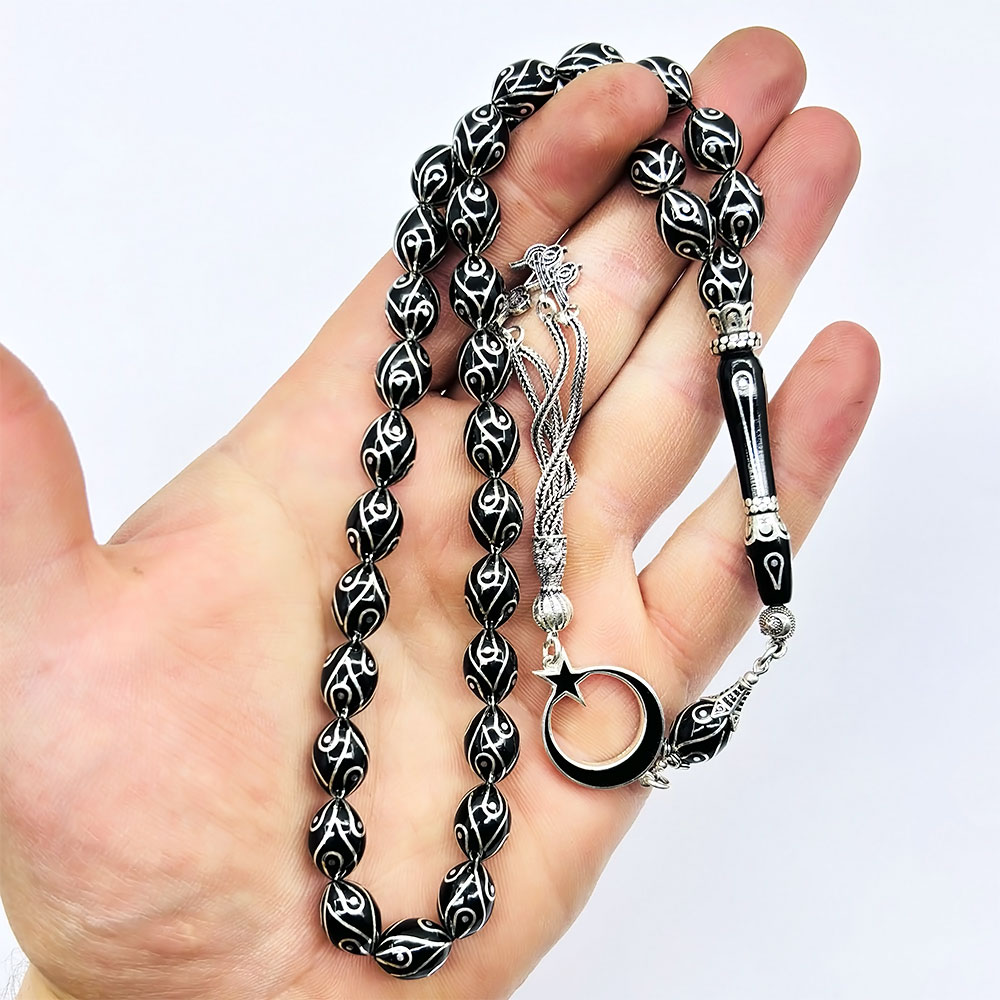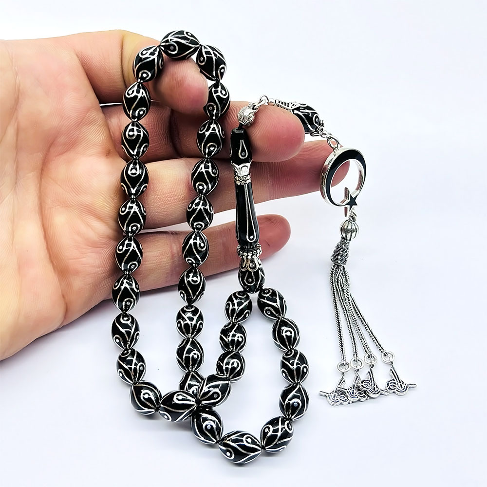 Gümüş İşlemeli Tavus Kuşu Model Orijinal Oltu Taşı Tesbih