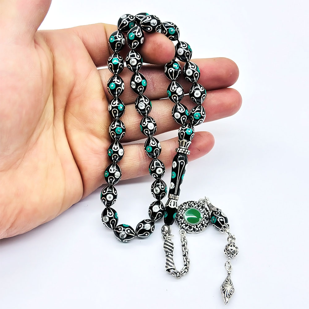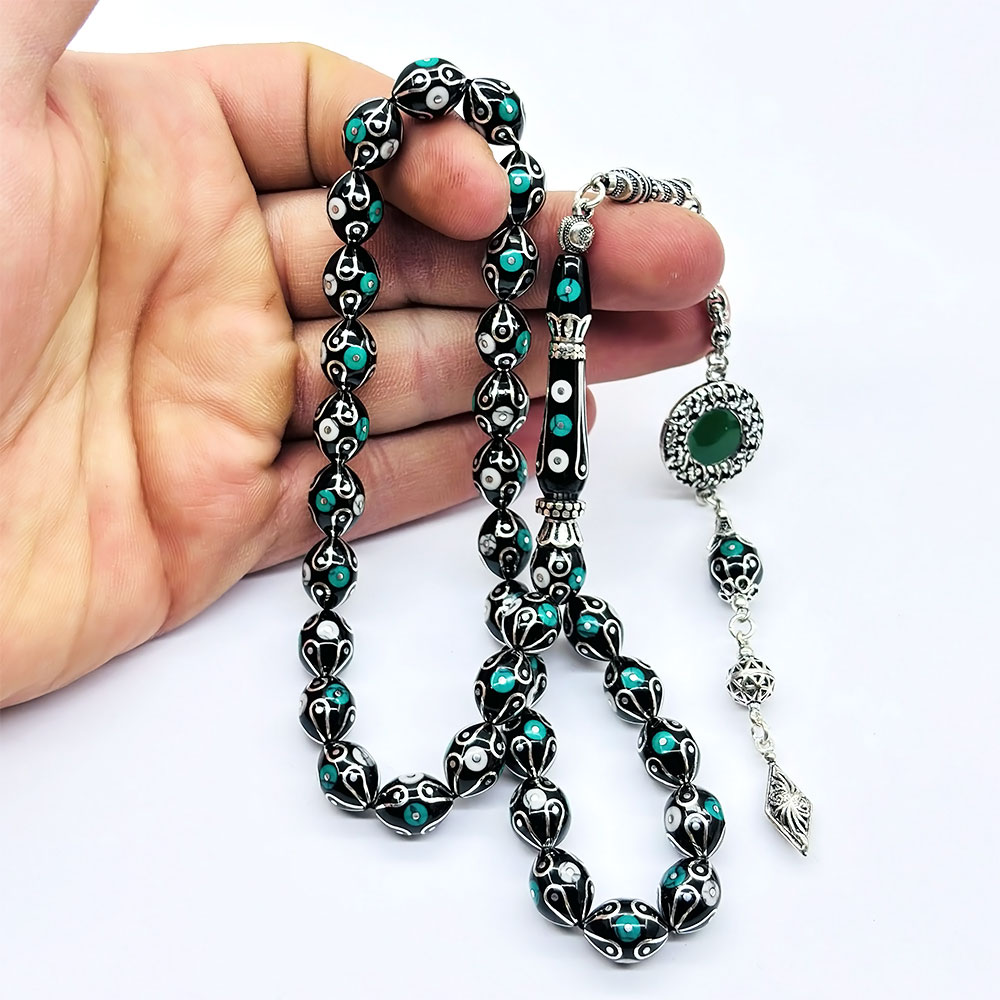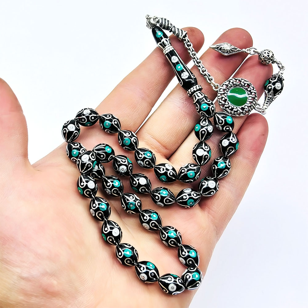 Gümüş İşlemeli Usta İşçilikli Orijinal Oltu Taşı Tesbih