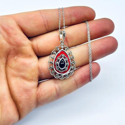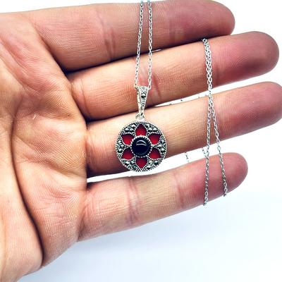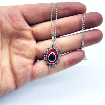 Margazit Kırmızı Mine ve Oltu Taşı İşçilikli 925 Ayar Gümüş Kolye