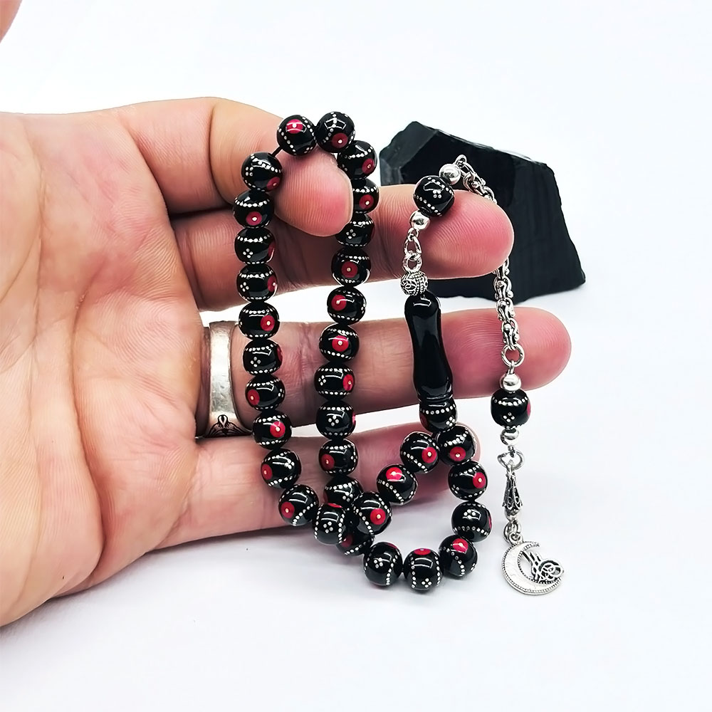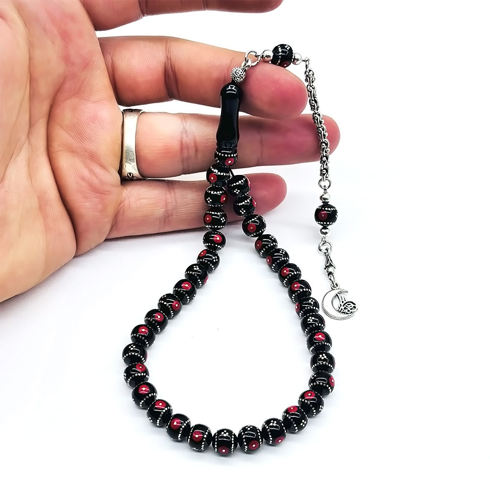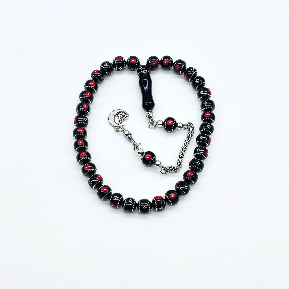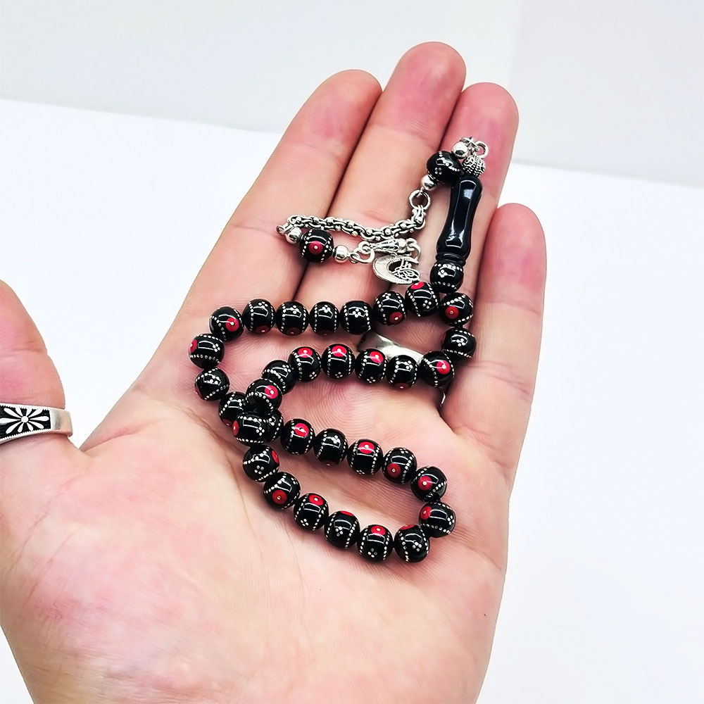 Kırmızı Bilek Boy Gümüş İşlemeli Erzurum Oltu Taşı Tesbih