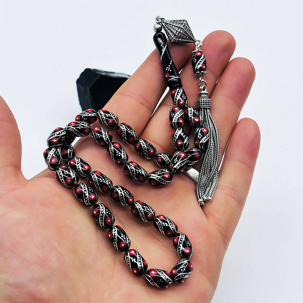 Çeçmi Arası Baklava Gümüş İşlemeli Oltu Taşı Tesbih