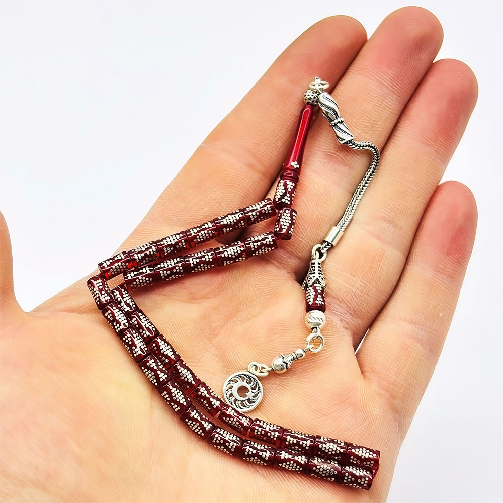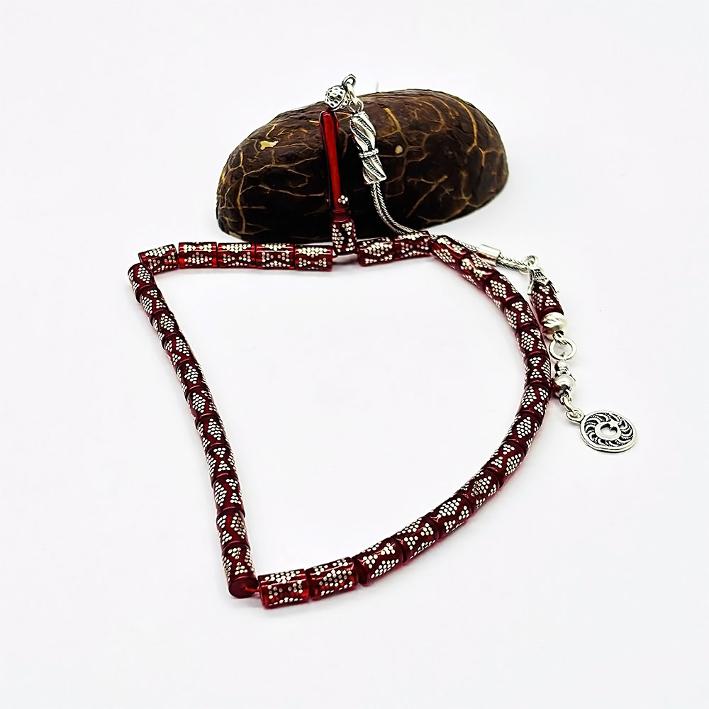 Kırmızı Gümüş İşlemeli Sıkma Ateş Kehribar Tesbih