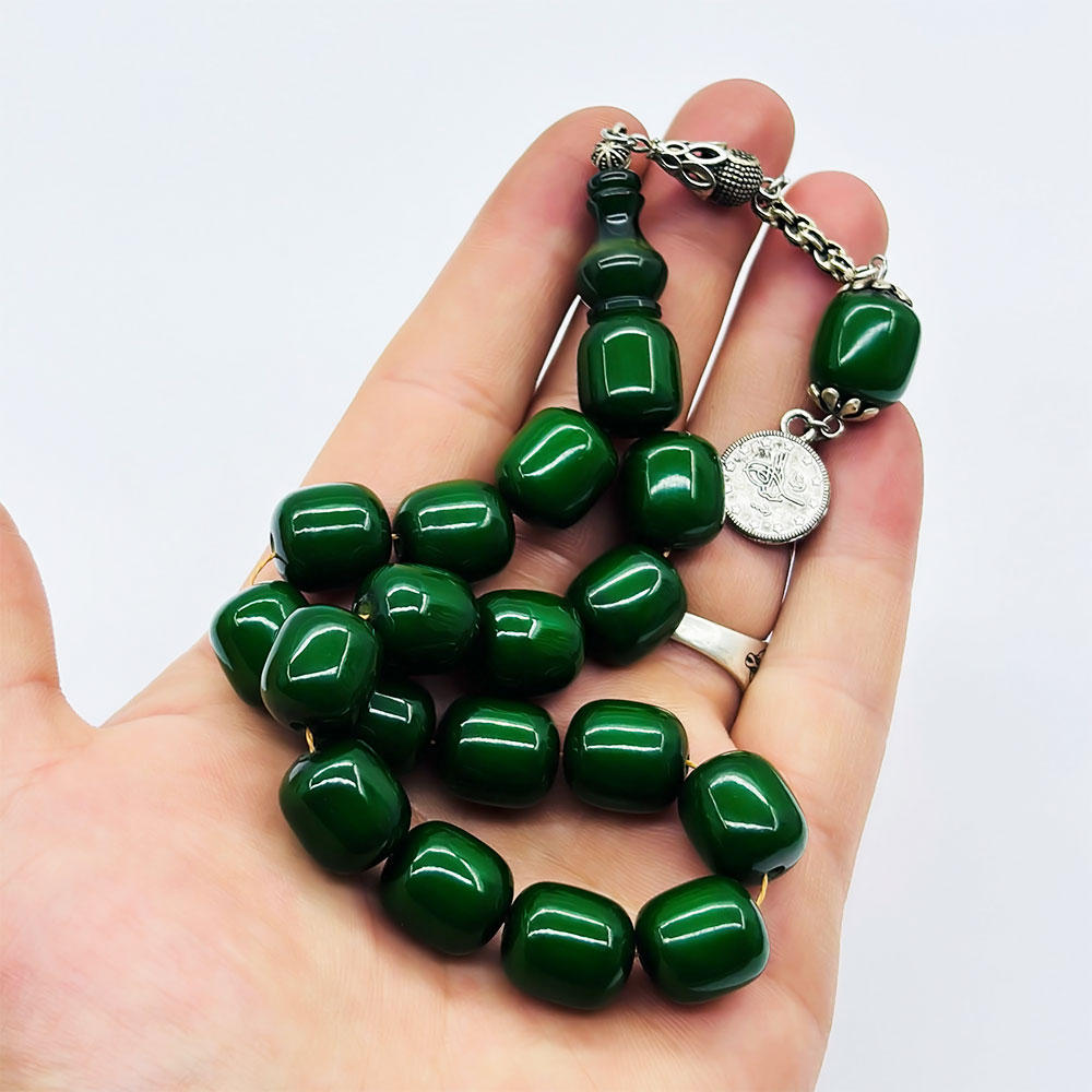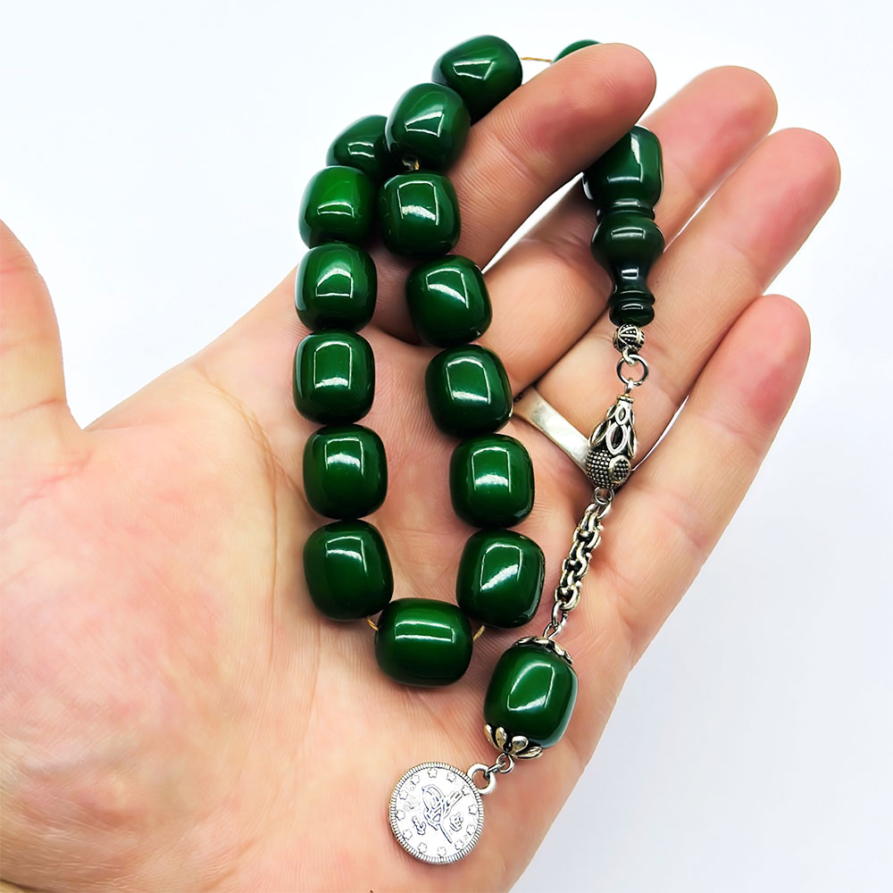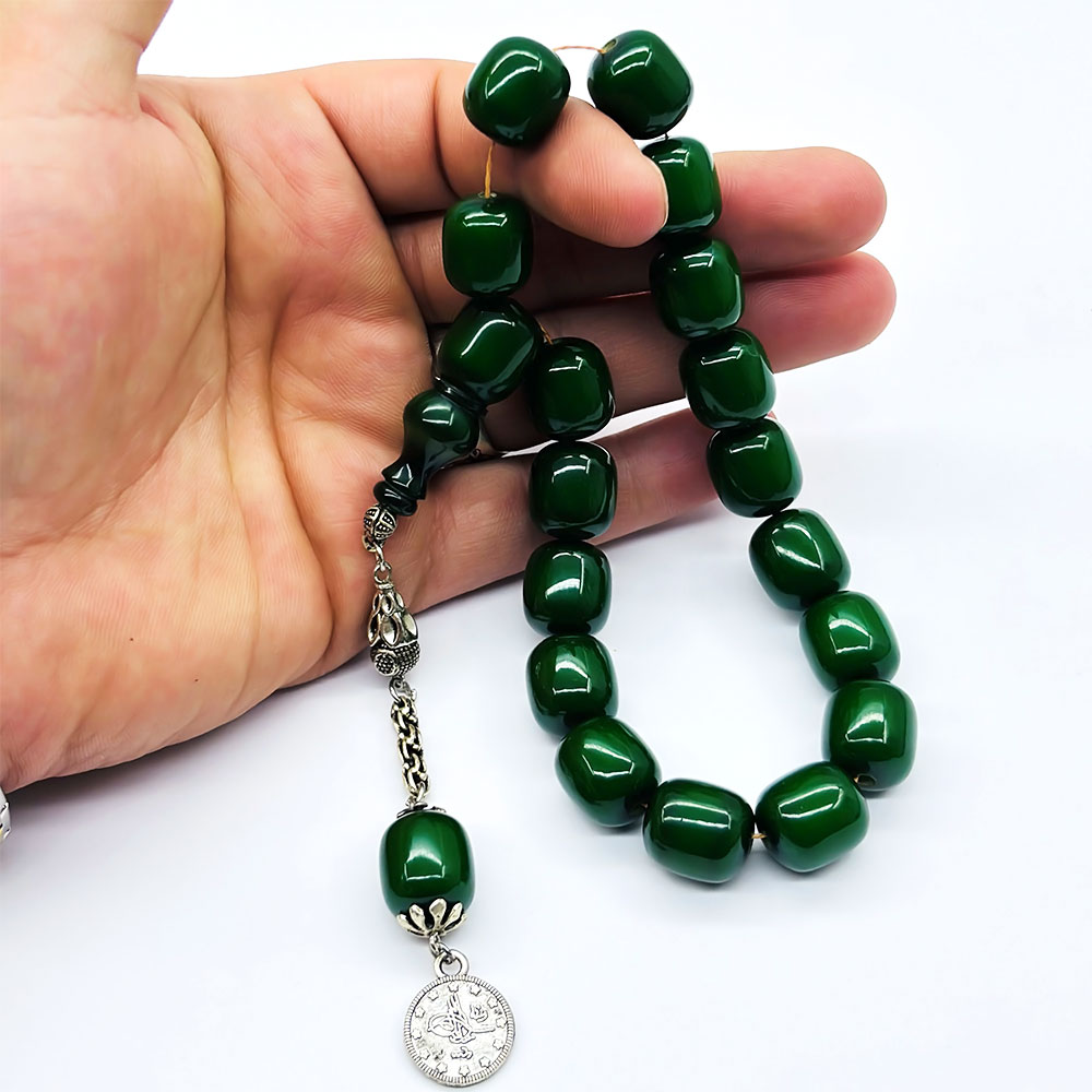 Koyu Yeşil Renkte Efe Maskot Sıkma Ateş Kehribar Tesbih