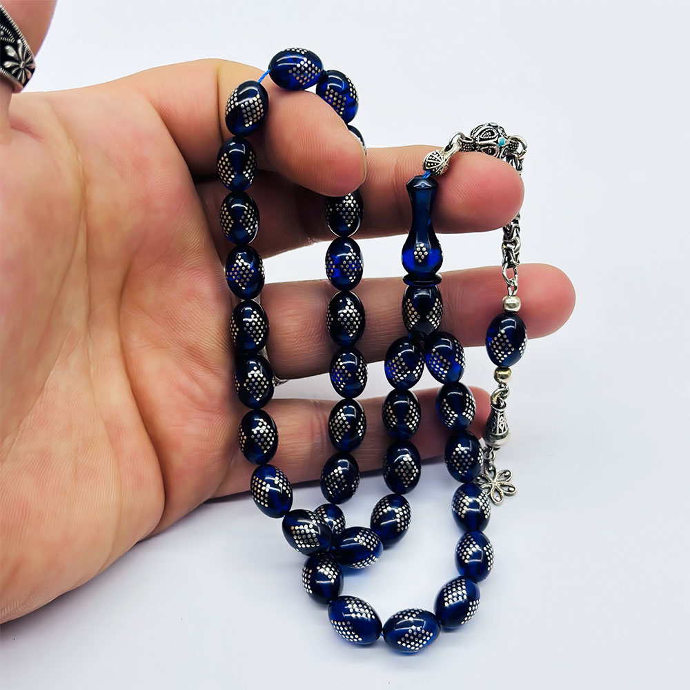 Mavi Renkte 925 Ayar Gümüş İşlemeli Sıkma Ateş Kehribar Tesbih