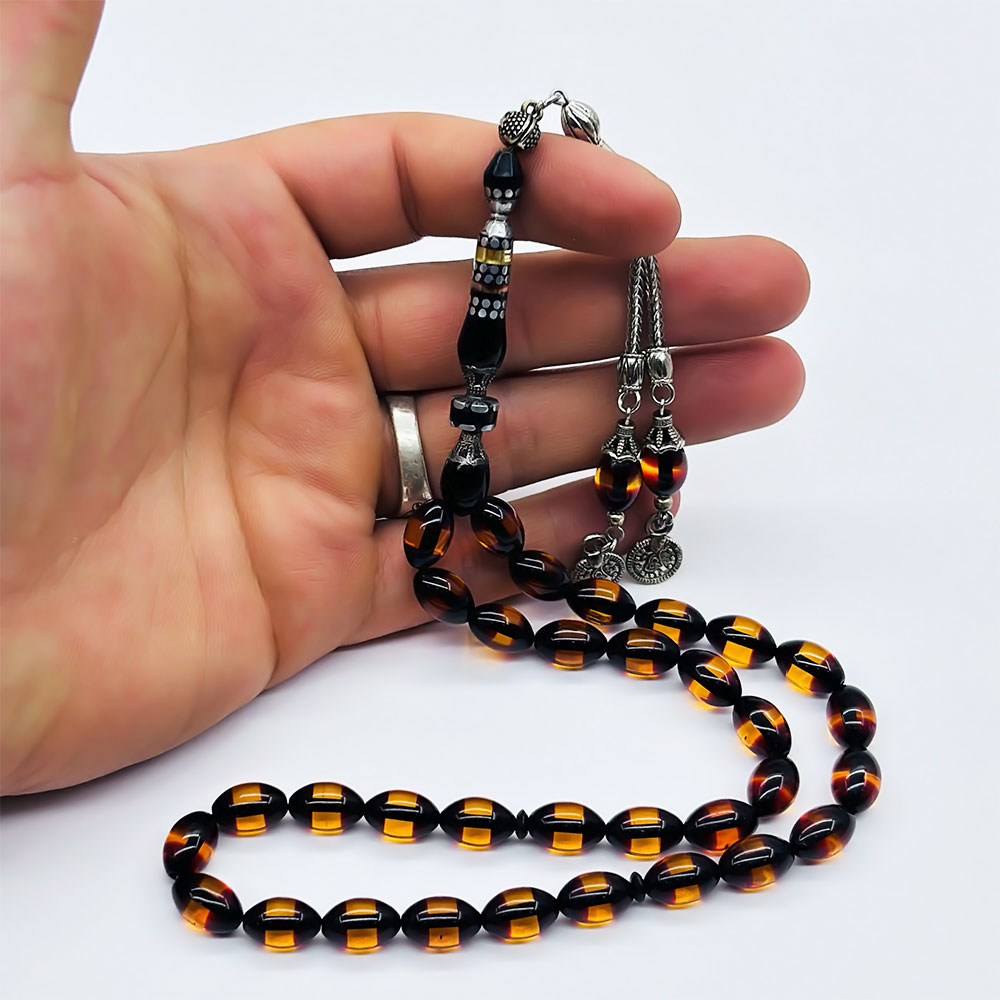 Koyu Tonda Bal Renk Simli Sürmeli Toz Kehribar Tesbih