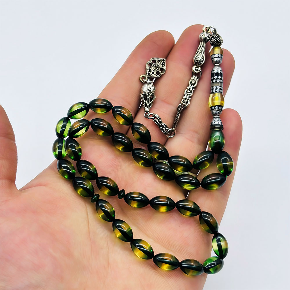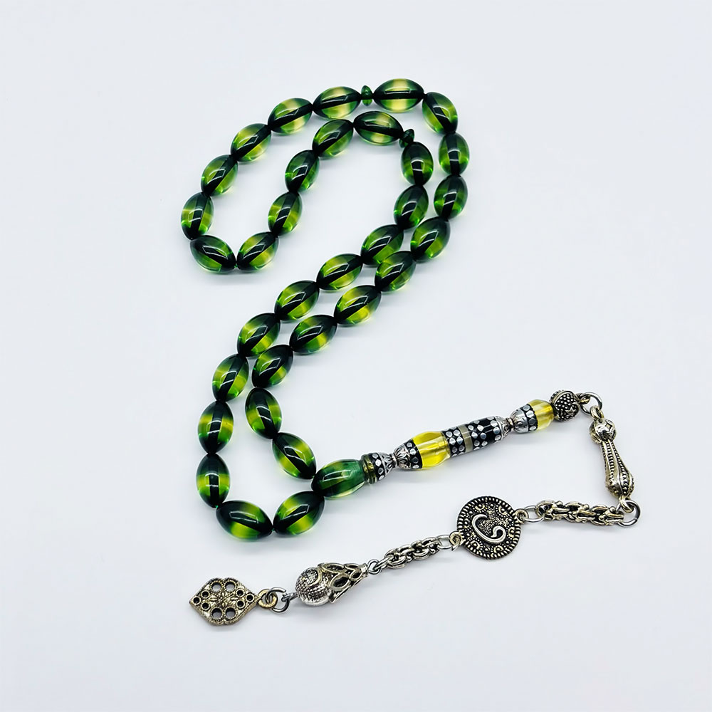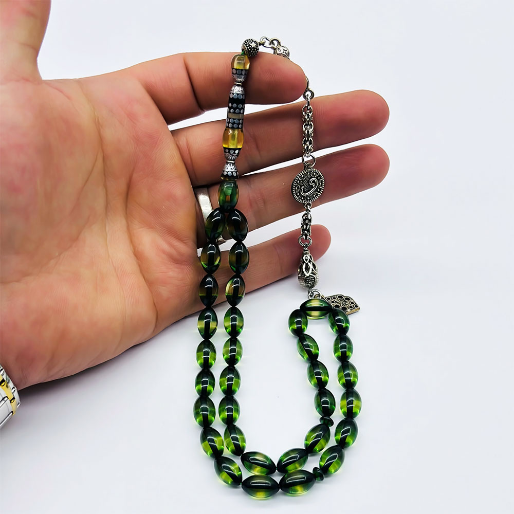 Nakkaş İmameli Yeşil Sürmeli Toz Sıkma Kehribar Tesbih