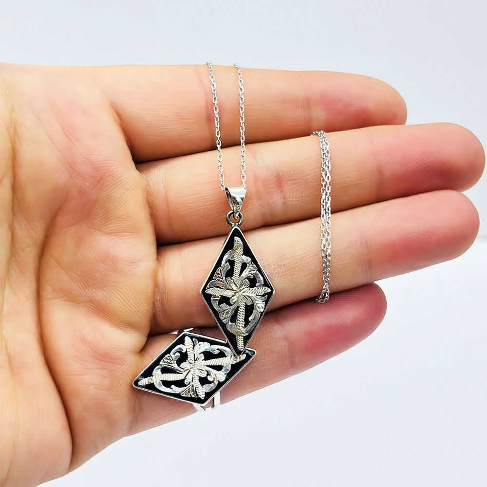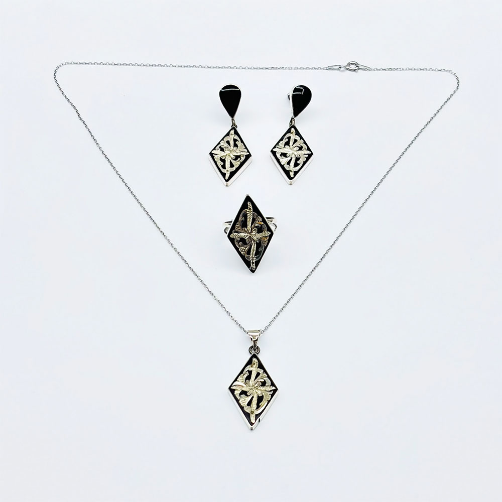 Nakkaş Oltu Taşı İşçilikli 925 Ayar Gümüş Yüzük Küpe Kolye Set