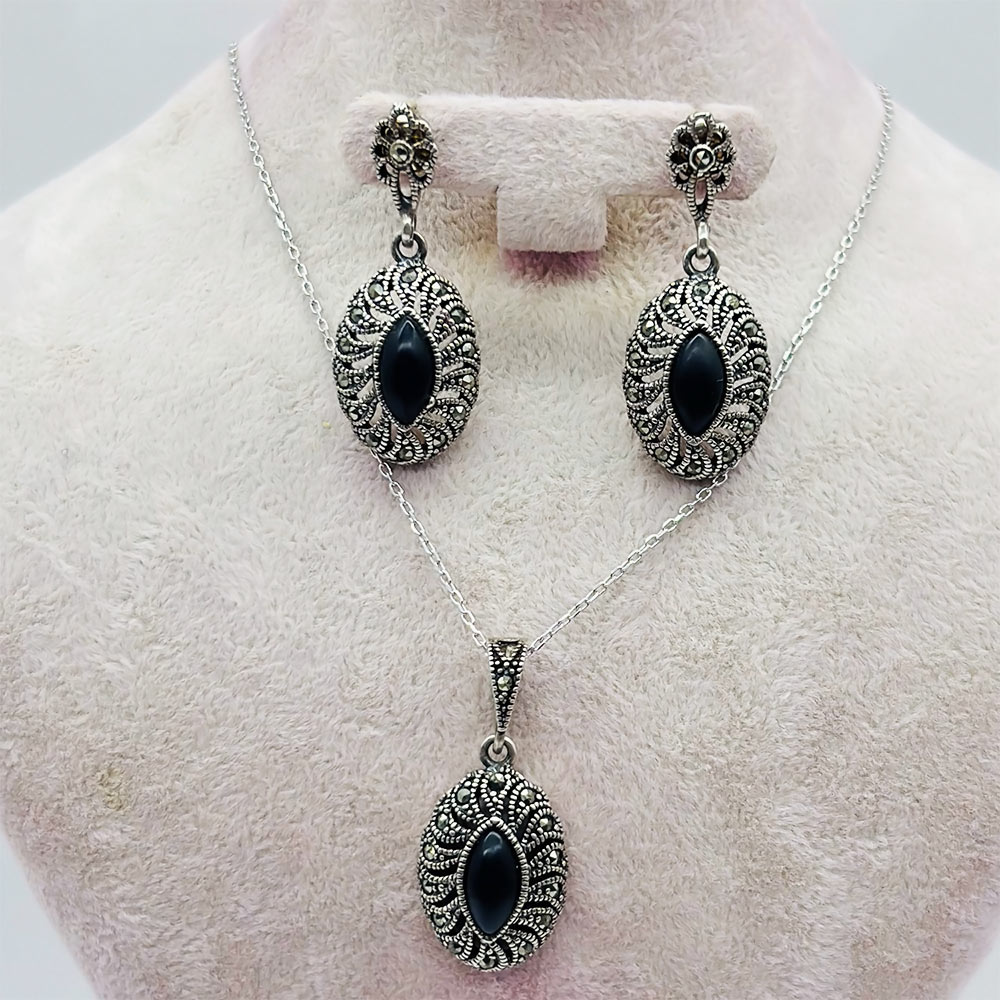 Oltu Taşı İşçilikli 925 Ayar Gümüş Kolye Küpe Yüzük Set