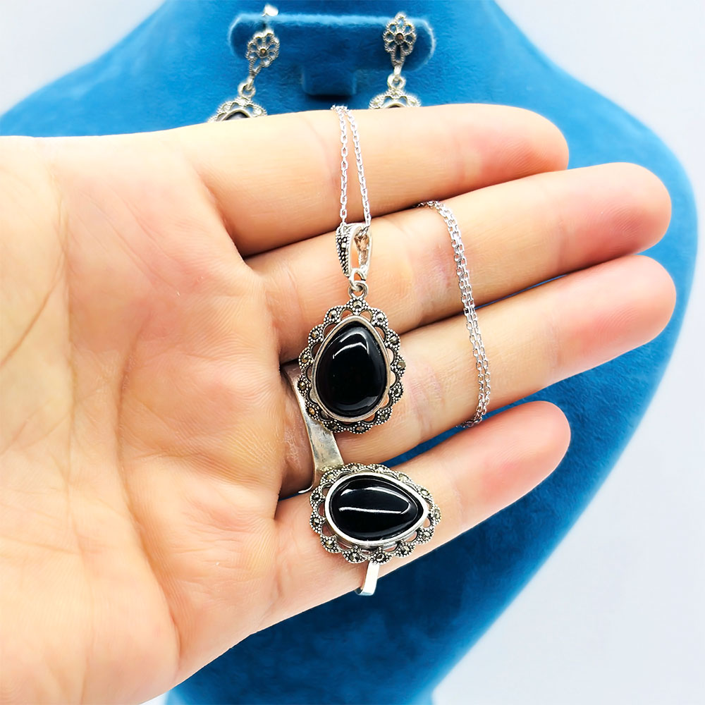 Oltu Taşı İşçilikli 925 Ayar Gümüş Yüzük Küpe Kolye Set