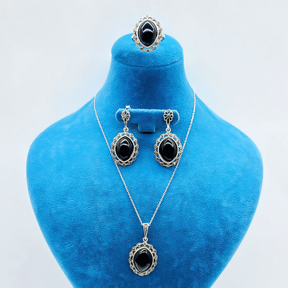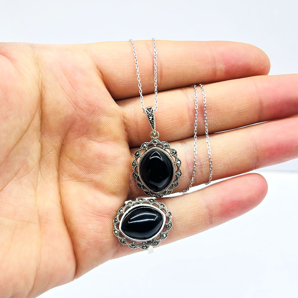Oltu Taşı İşçilikli 925 Ayar Gümüş Yüzük Küpe Kolye Set