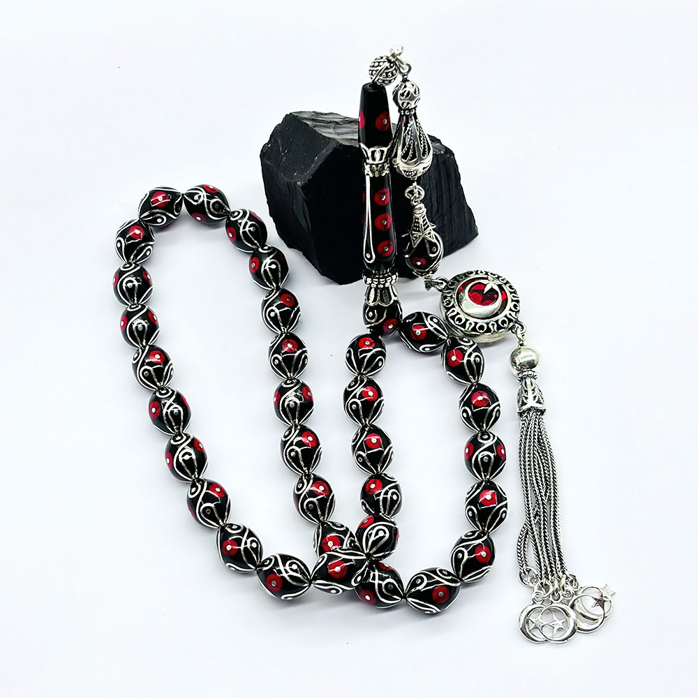 Özel Motif Gümüş İşlemeli Orijinal Oltu Taşı Tesbih