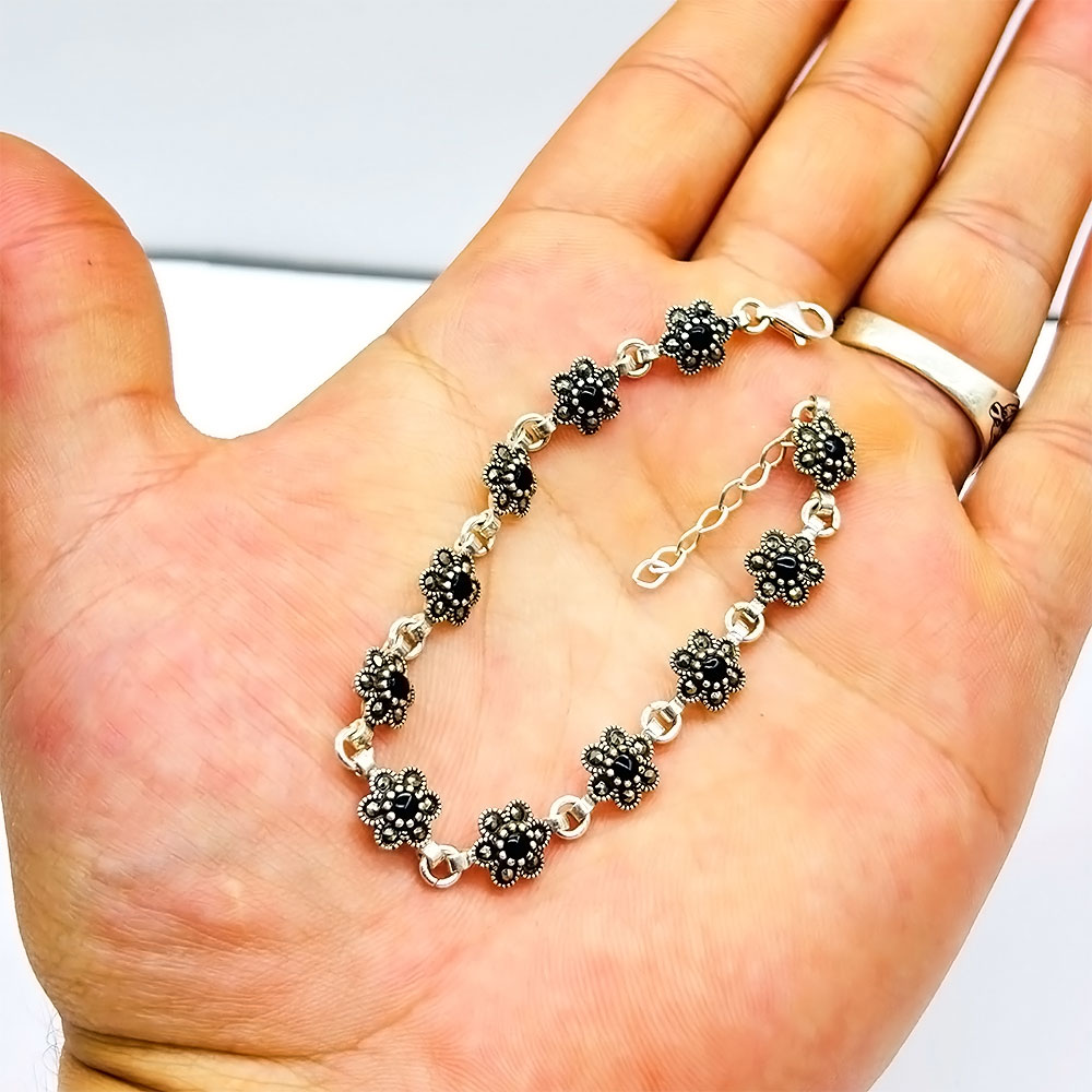 Papatya Model Oltu Taşı İşçilikli 925 Ayar Gümüş Bileklik