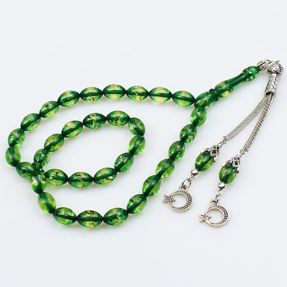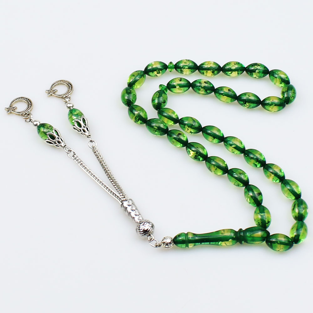 Parçacıklı Yeşil Beyzi Taneli Sürmeli Toz Kehribar Tesbih (7 x 11 mm) TP001509