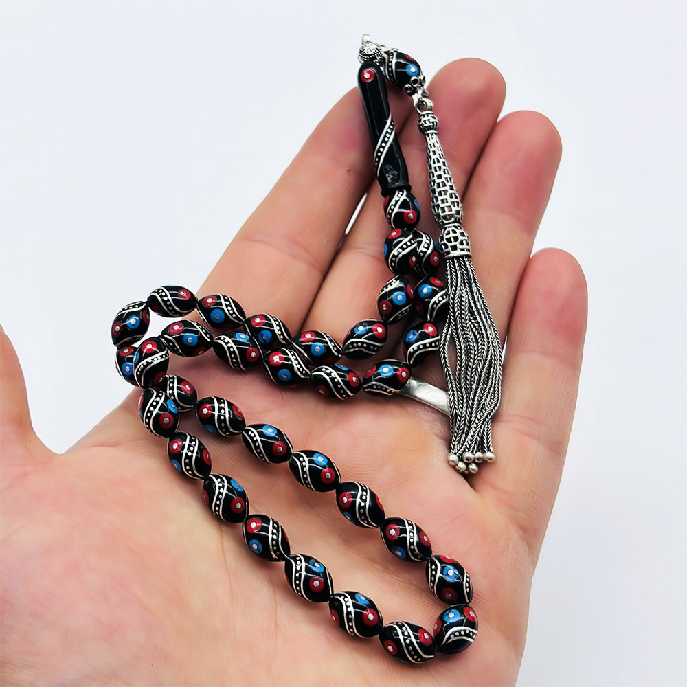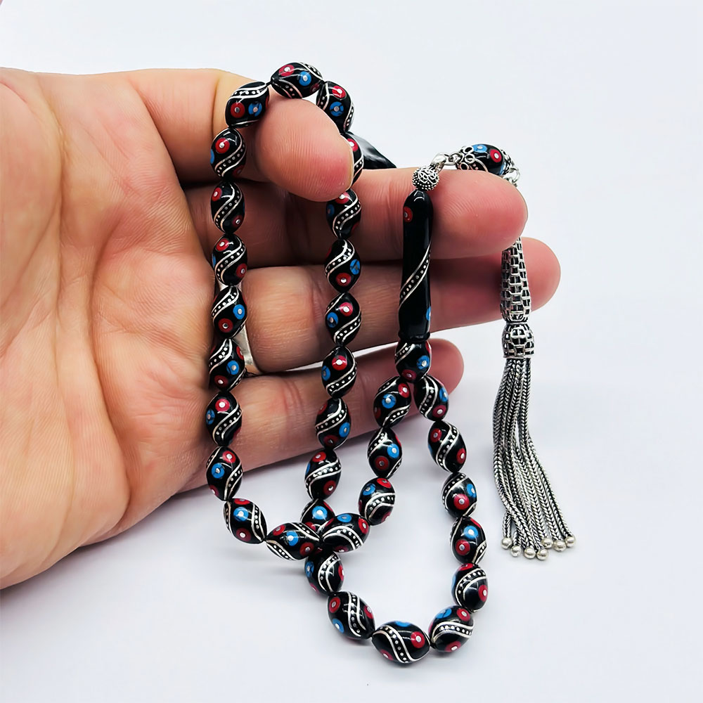 925 Ayar Gümüş İşleme renkli Orijinal Oltu Taşı Tesbih
