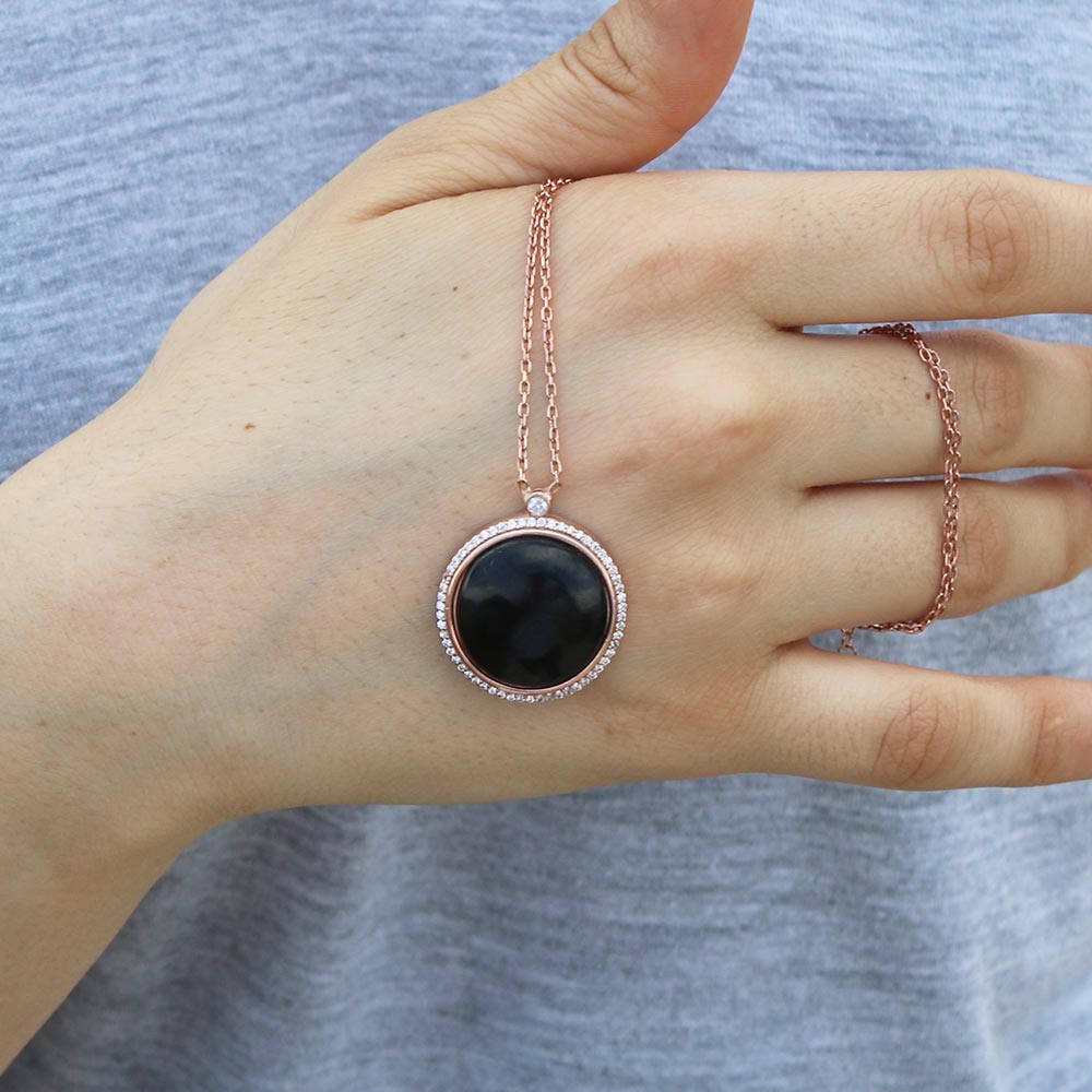 Özel karton kutusu ve özellikleri belirtilen kolye |