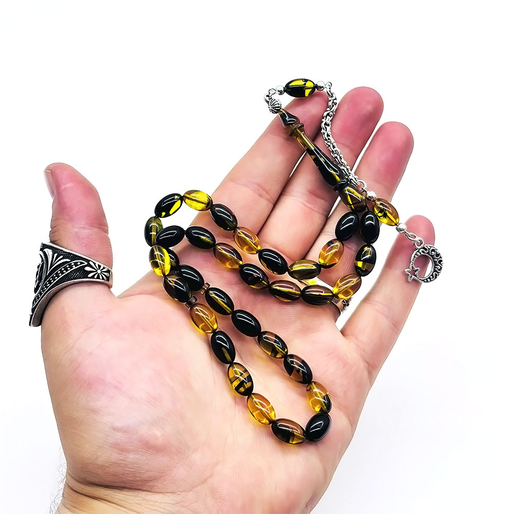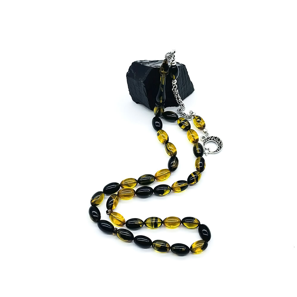 Sarı Siyah Hareli Sıkma Ateş Kehribar Tesbih