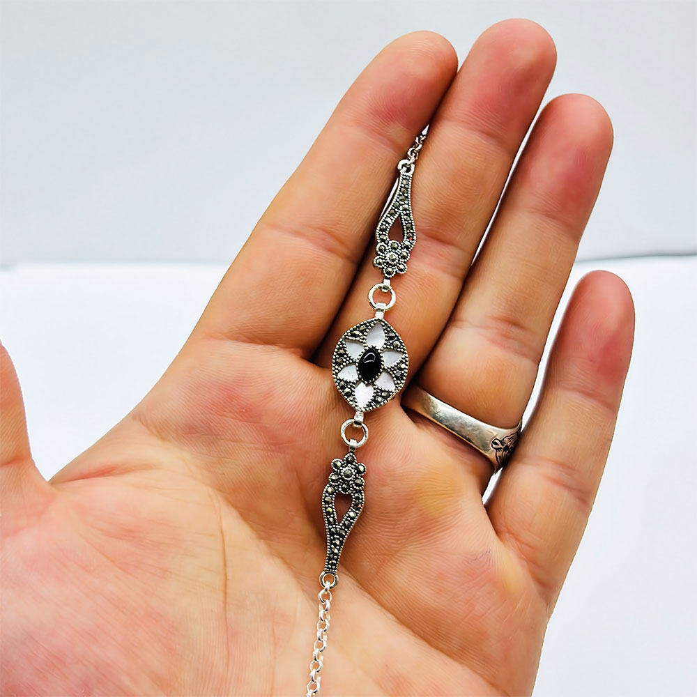 Sedef ve Oltu Taşı İşçilikli 925 Ayar Gümüş Bileklik