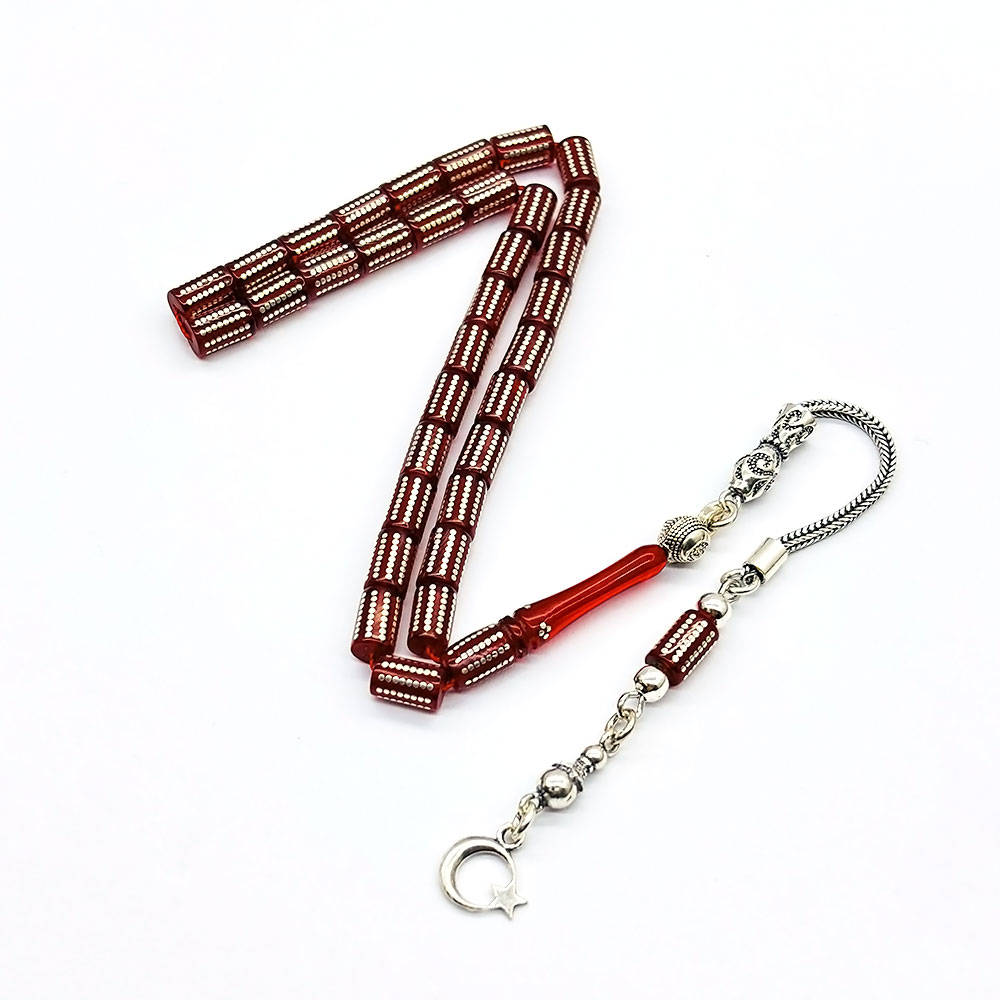 Kırmızı Gümüş İşlemeli Bilek Boy Sıkma Ateş Kehribar Tesbih İşlemeli Kehribar