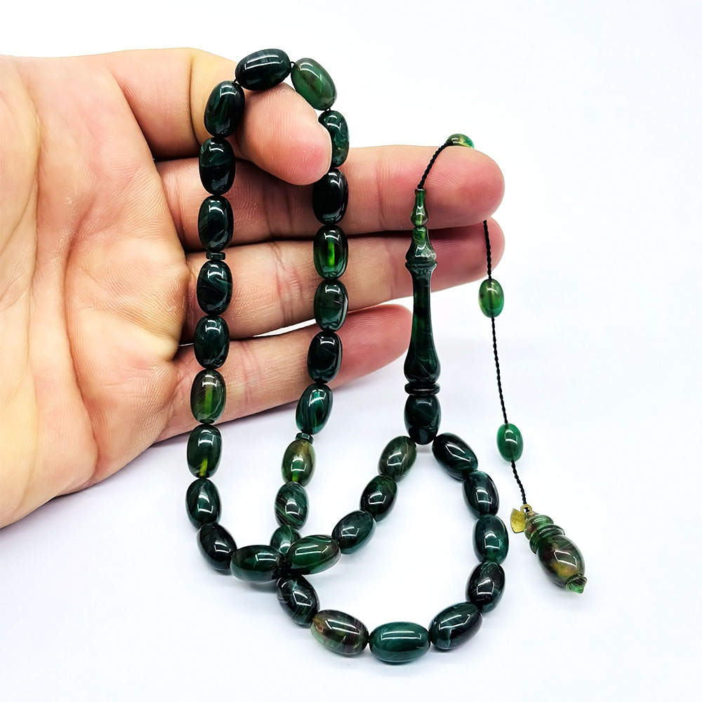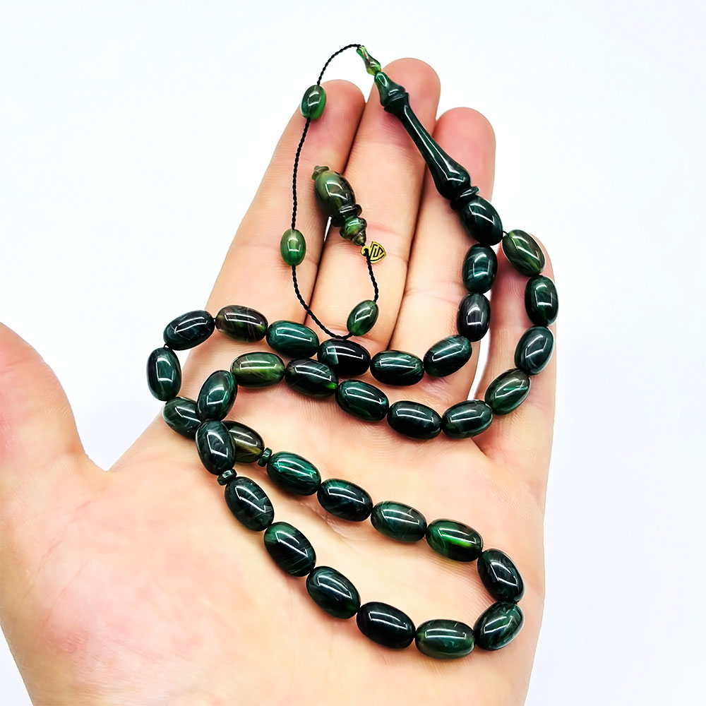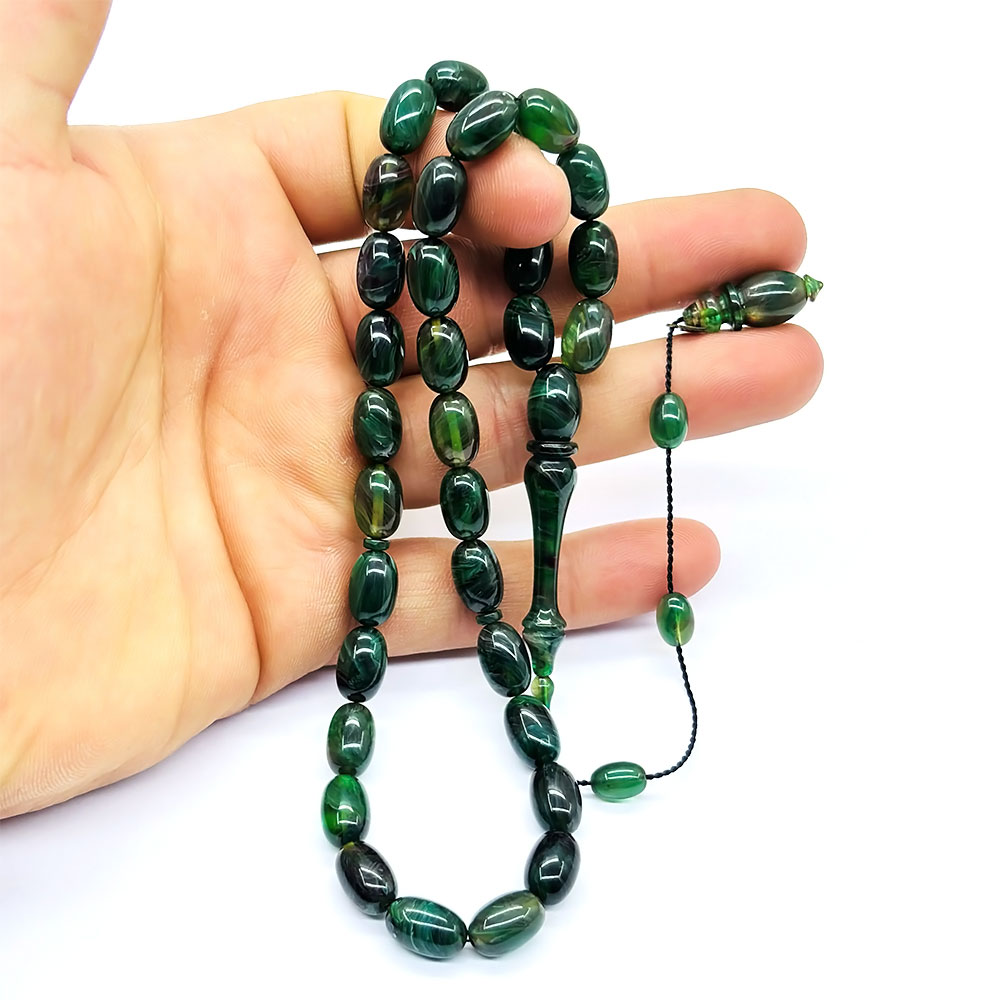 Usta İşçilikli Yeşil Hareli Sıkma Kehribar Tesbih