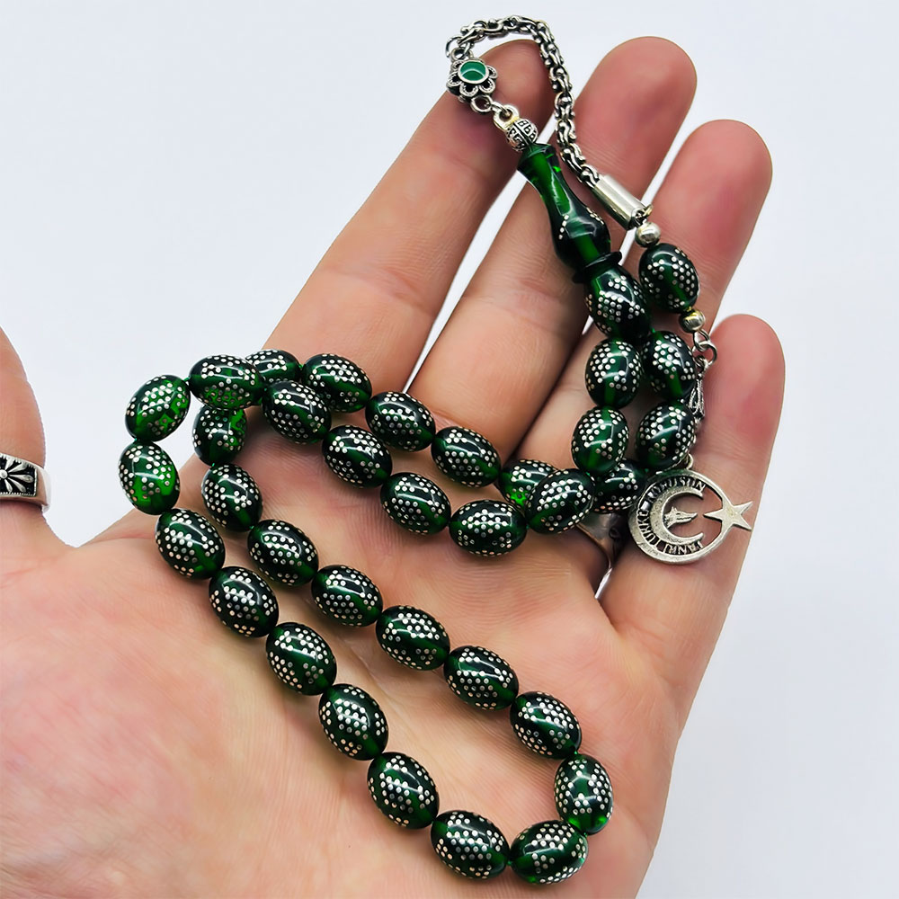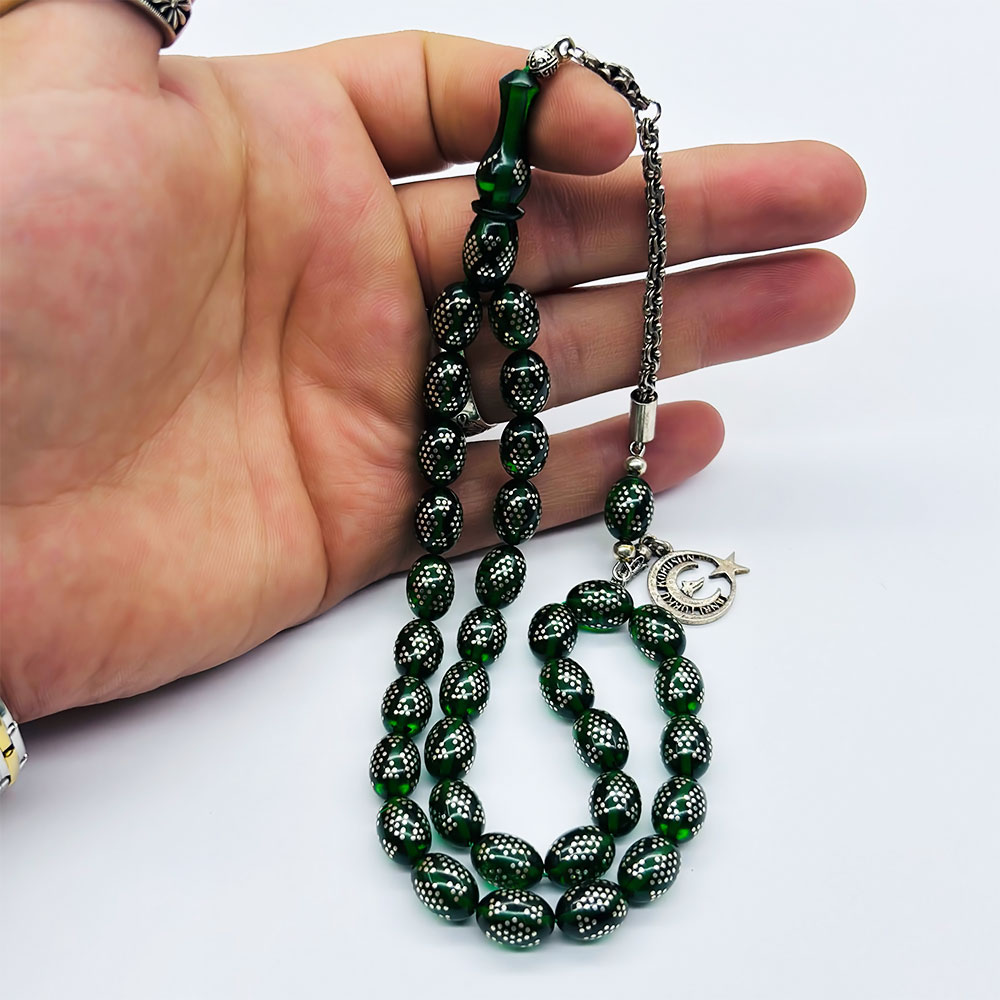 Yeşil Renkte 925 Ayar Gümüş İşlemeli Sıkma Ateş Kehribar Tesbih