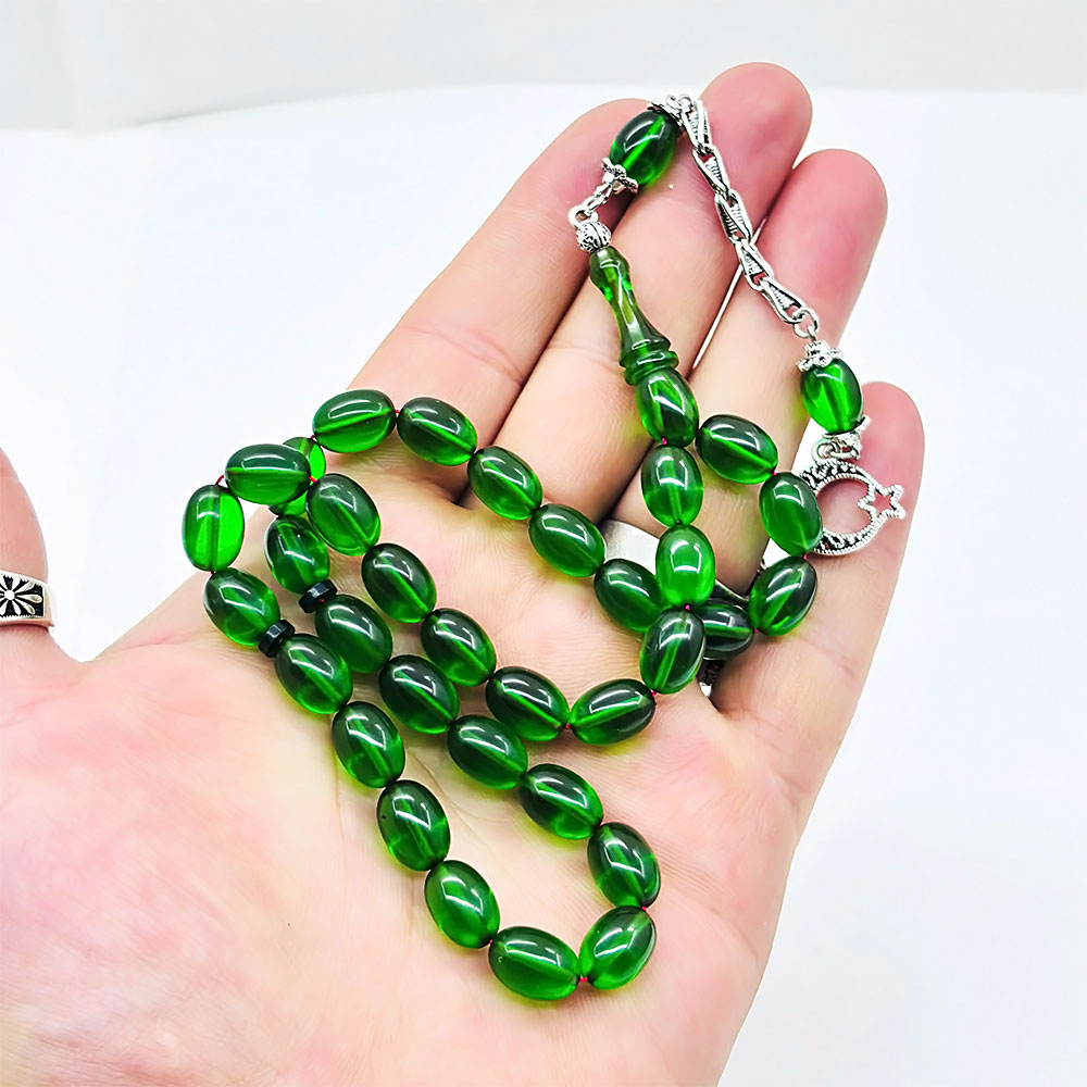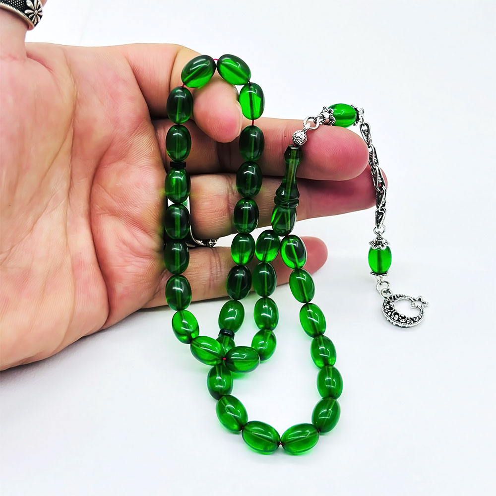 Yeşil Renkte Beyzi Kesim Sıkma Ateş Kehribar Tesbih