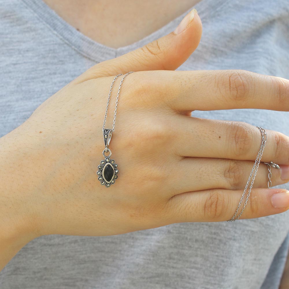 Zarif Baklava Model Gümüş Ve Oltu Taşlı Kolye